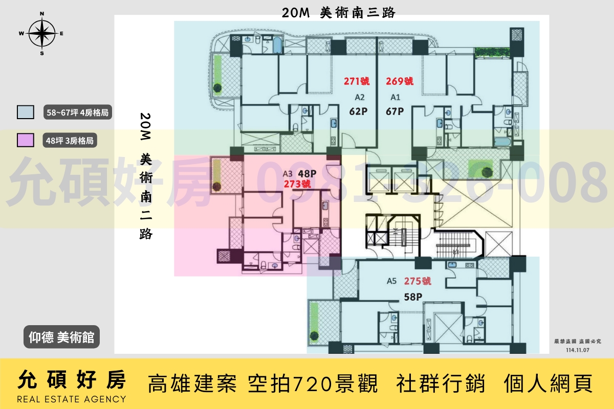 坪數規劃:三房(48~58坪) 、 四房(62~67坪)。