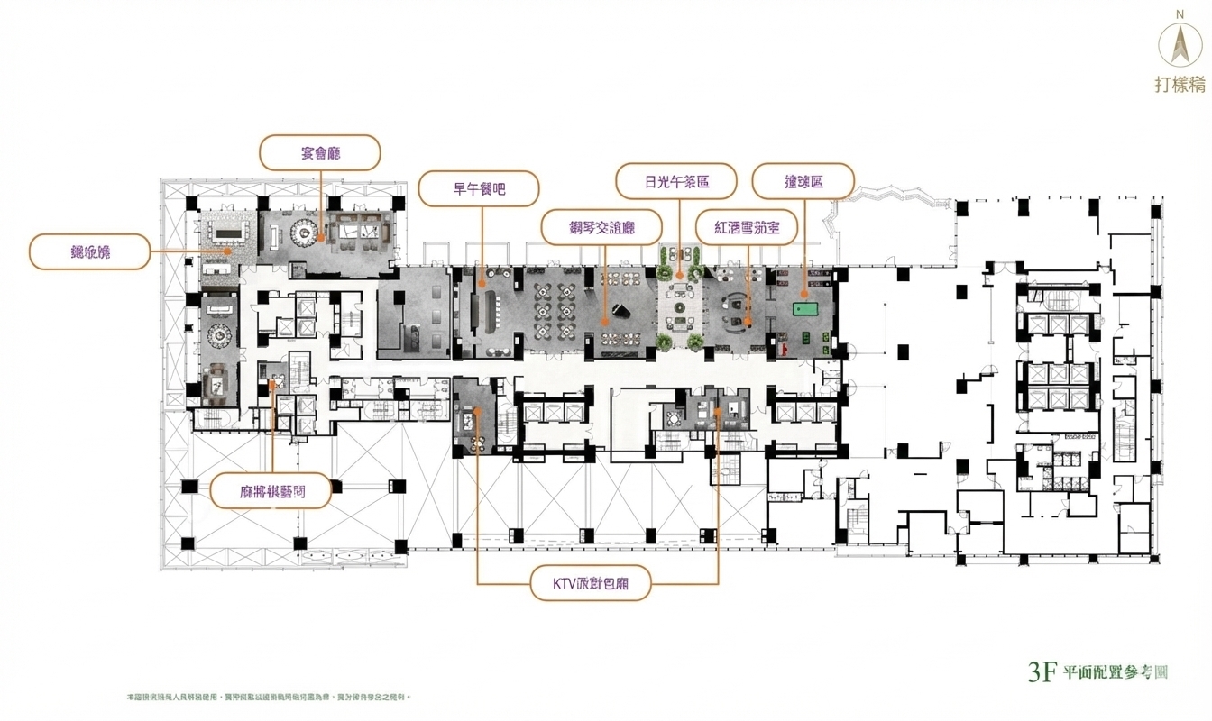 三樓:宴會廳、交誼廳、KTV、LoungeBar、PianoBar、雪茄館、球藝區。