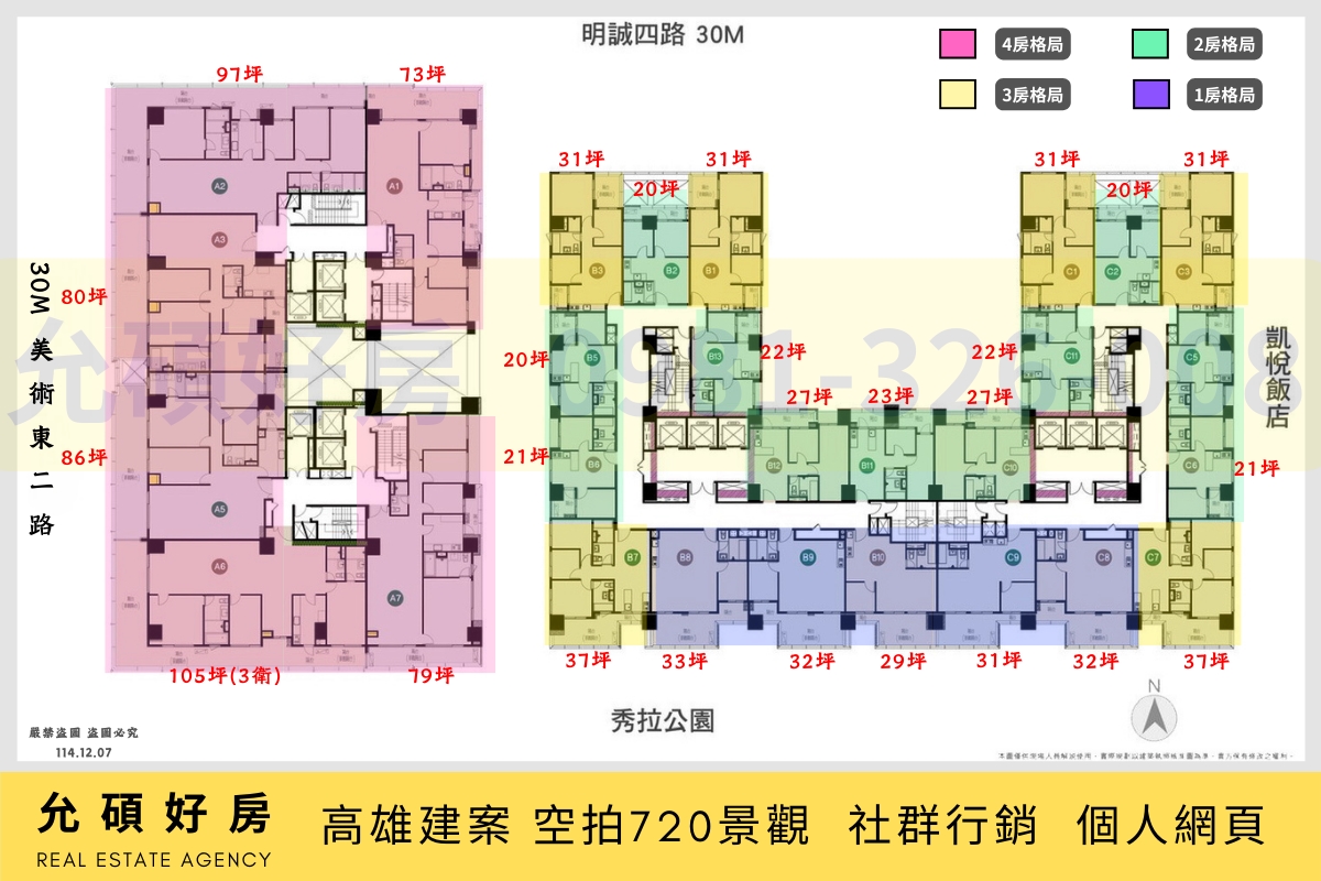 坪數規劃:二房(20~26坪) 、 三房(30~38坪)、四房(73坪~105坪)。